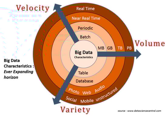 Until now, resilience management has largely focused on descriptive (i.e., what happened?) or diagnostic analytics (i.e., why it did happen?) following an expert judgment-based approach [33]. Today, emerging technological innovations such as IoE (including social media, location-based systems, and big data analytics—BDA) have opened up the opportunity for real time monitoring (i.e., what it is happening?), thus, a dynamic evidence driven system resilience management [2,14,34], and predictive analytics based on increasingly reliable big data (i.e., what it will happen?) is now at hand. Ad depicted in Figure 2, Big data are usually related to the 3V (velocity, volume, variety), but the perspective is becoming wider with 4V (+value), 5V (+veracity) [35], etc. According to [36], a fourth V has been added to the standard 3V, namely ‘value’ and identified as the capability of the big data, to generate a public value in different contexts, such as: business, social, political, etc.