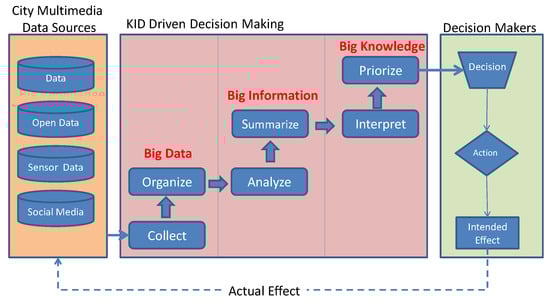 KID (knowledge, information, data) driven decision-making process in urban context. Different data sources available in the smart city should be properly processed to became valuable knowledge for decision makers.