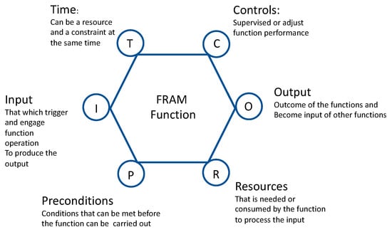 The fundamental step in the use of this method is the identification and description of functions and their interdependencies. In Figure 4, the FRAM function is represented. Each function is defined by six descriptors (time, control, output, resource, precondition, and input). A function refers to the activity—or to a set of activities—of the system which are required to produce an expected outcome.