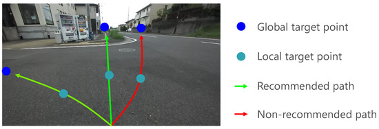 In this study, we propose a recommended traversable area detection system that can be adapted to environments with no edges using automatically labeled data based on human knowledge and experience. The overall navigation system proposed is shown in Figure 2. This system consists of three planning stages: global path planning, local path planning, and motion planning. The global path is planned based on a topological map, while the local path is planned based on a map representing driving recommendation degree information, and the motion planning stage determines system operations, such as vehicle velocity and a steering angle, that appropriately compensate for safety based on spatial information obtained from the LRF. The role of the recommended traversable area detection system in the overall navigation system is to provide appropriate choices of driving directions when planning local paths. Appropriate choices mean that the system can detect multiple recommended directions when there is more than one recommended direction and that the system does not interpret areas where driving is not recommended as being suitable for driving, such as roadways where there is a distinction between roadway and sidewalk. The scope of this study is framed in red in Figure 2, and the main contributions in that part are as follows: