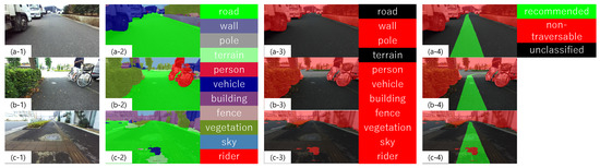 Example of non-traversable area labeling: Column 1, original image; Column 2, labeled image in 11 classes and colors to indicate each class; Column 3, labeled image of a class of non-traversable objects (road, wall, pole, person, vehicle, building, fence, vegetation, sky, and rider); and Column 4, labeled image of recommended area and non-traversable area. (a-1)–(c-4) are the image numbers referred to in the text.