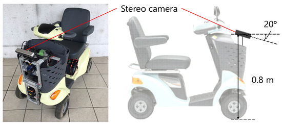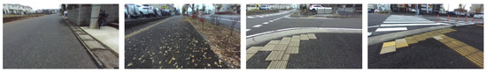 Many autonomous mobility systems have been proposed for pedestrian environments such as sidewalks and community roads, among which many require accurate localization based on map information constructed using sensors such as a laser range finder (LRF). However, maintaining maps with precise structural information for all roads involves significant time and expense. In contrast, a method that uses a topological map for autonomous driving in unknown outdoor environments has also been proposed [3,4,5,6]. A topological map is a map represented by a combination of nodes on a road network representation, with links representing road sections between nodes. Existing systems using topological maps are generally based on road-following navigation using road boundaries, which are detected by edge features extracted from camera images [3,4] or physical features extracted by LRF [5,6]. However, when road-following navigation is applied in an environment where roadways and sidewalks coexist, as shown in Figure 1, a target point may be incorrectly set on a roadway based on mechanical traversability and continuity of the road surface texture. Personal mobility systems should avoid entering roadways because, if they enter and run along the road, they are likely to remain there. Therefore, in an environment where the roadway and sidewalk coexist, it is necessary to estimate a driving area that is both mechanically traversable and recommended by traffic rules and to navigate based on this estimation. In this paper, the area where the terrain is mechanically traversable and driving is recommended by traffic rules is defined as the recommended traversable area, and the degree of the recommendation is defined as driving recommendation degree.