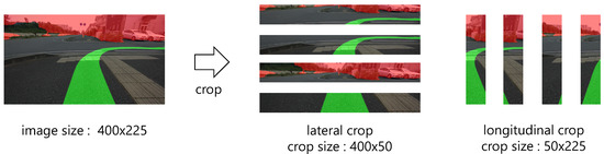The automatically labeled recommended area is the area extending forward from the bottom center of the image, as shown in the fourth column of Figure 5. Therefore, the trained model may over-fit the location and shape of the recommended area in the image. To suppress over-fitting for location and shape, it is considered effective to crop the input image. However, cropping also leads to the loss of context information. Hence, as shown in Figure 8, we propose both lateral crop processing, which functions to preserve lateral context and to suppress over-fitting for longitudinal position, and longitudinal crop processing, which functions to preserve longitudinal context and to suppress over-fitting for lateral position.
