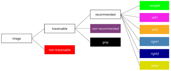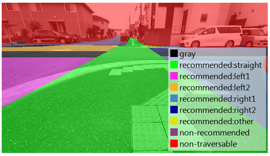 To evaluate the effectiveness of the proposed methods for the required functions of our recommended traversable area detection system, a manually labeled dataset was created for images collected in environments where the roadway and sidewalks coexist. The labeled classes are the nine classes shown in Figure 9. To evaluate the detection rate and misclassification rate of non-traversable areas, we first categorized the image area into two classes according to traversablity. Next, to evaluate whether the trained model fails to detect non-recommended driving areas as recommended areas, we divided the traversable areas into three classes: recommended, non-recommended, and gray, based on traffic rules. Finally, to evaluate the performance in detecting selectable driving directions as recommended areas, we classified the recommended area into six driving directions. The definitions of the three classes of traversable areas, namely recommended, non-recommended, and gray, are shown in Table 3. In this study, we created 100 images labeled into the nine classes shown in Figure 9 and horizontally flipped them to create a dataset of 200 images for evaluation. An example of the labeled images is shown in Figure 10.