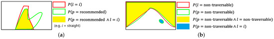 where {straight, left1, left2, right1, right2, other, non-recommended, gray} is the type of manual label, {recommended, non-traversable, unclassified} is the prediction label of the output image by the trained model, and {straight, left1, left2, right1, right2, other, non-recommended, gray, non-traversable} is the label of the image for evaluation, indicates the number of pixels per evaluation image satisfying the condition ·, and ∑ means to take the sum of for each of the 200 evaluation images. As shown in Figure 11a, represents the intersection area of the area predicted as recommended and the area manually labeled as i, and represents the area labeled as i. That is, is the detection rate of each of the areas labeled with i, and the detection rate should be high for the recommended directions, such as straight and left1, and low for the non-recommended directions.