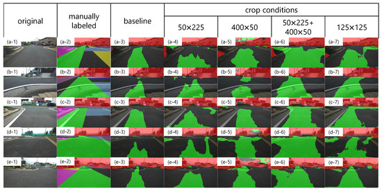 Finally, we discuss the results for the 125 × 125 condition. Despite the lateral image cropping, the detection rate of non-traversable areas did not decrease with respect to the baseline results as it did in the 400 × 50 condition. This is because the length of one side of the cropped image is more than half the height of the image, which is long enough to capture the context of the non-traversable areas in the upper quarter of the image. In terms of the recommended area, it increases compared to the baseline. This is likely due to the suppression of over-fitting of longitudinal and lateral positions. However, the detection rate of the recommended area is lower than that of the 50 × 225 + 400 × 50 conditions. This is likely due to the lack of information on the lateral continuity of the paths in the image after cropping. As a result, there is a break in the lateral path, as shown in Figure 12(a-7,d-7). In other words, the inability to maintain path continuity information by cropping in both the longitudinal and lateral directions to the same extent may lead to a decrease in the detection rate of recommended areas.