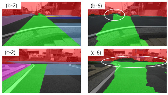 Next, we discuss the results for the 50 × 225 + 400 × 50 conditions. The detection rate of recommended area increased the most. In particular, left1 and right1 are substantially increased compared to the 50 × 225 condition and 400 × 50 condition. This is considered to be a result of synergistic effects of suppressing over-fitting of the estimated position of the recommended area near the vehicle and maintaining lateral continuity. In addition, although the detection rate of non-traversable areas was reduced for 400 × 50 cropping alone, 50 × 225 cropping preserved the longitudinal context and maintained the detection rate. However, in addition to the increase in the detection rate of recommended areas, the detection rates of non-recommended and gray areas also increased slightly, as shown in Figure 13b. As for the non-recommended area, as shown in Figure 12(b-6), the roadway in the distant area is predicted to be a recommended area. In addition, as shown in Figure 12(c-6), we found a scene where the recommended area was detected not on the nearby sidewalk, but on the distant roadway. Figure 12(b-2,b-6,c-2,c-6) are enlarged in Figure 14. This may reflect the result of using driving experience on a roadway where the road and the sidewalk are indistinguishable as training data. Comparing Figure 12(e-6) with Figure 12(b-6) and Figure 12(a-6) with Figure 12(c-6), there are differences in the timing at which the sidewalk can be detected as a recommended area in similar scenes. Therefore, it is necessary to verify which direction can be planned as a path when dealing with successive driving recommendation degrees. The reason for the increase in the detection rate of the gray area is that the center of the roadway is also predicted as recommended area on roads with is no distinction between roadway and sidewalk, as shown in Figure 12(a-6).