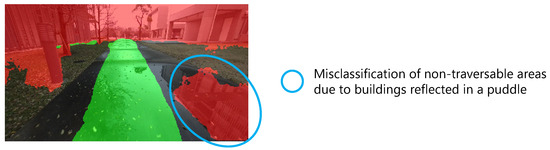 Example of misclassification of non-traversable areas due to non-traversable objects reflected in a puddle.