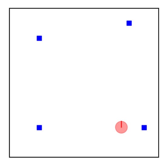 Simulation environment. The red circle represents the 2D robot position, the red line within the circle represents the robot’s heading, the blue rectangles represent the landmarks that are detected by the robot.