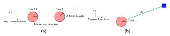 In the running example [10], the robot’s forward displacement is measured in meters and its change in rotation is measured in radians. For formulating a process model, it is assumed that the robot first moves forward m in the direction of its heading and then rotates rad, as is shown in Figure 2a. The resulting process model therefore is: