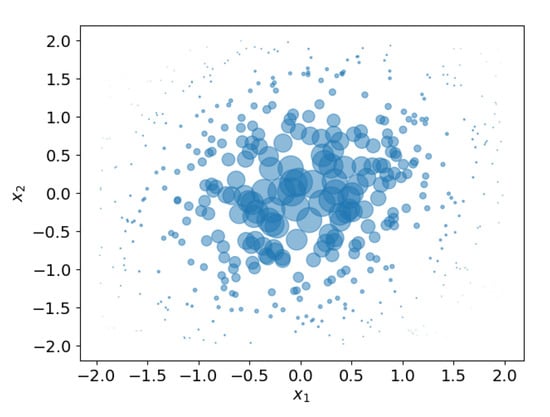 Set of 500 weighted samples (clue circles) estimating a 2D zero mean Gaussian distribution. The radius of a sample is proportional to its weight.