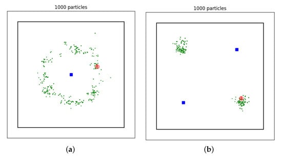 One of reasons for the popularity of particle filters is their ability to represent posterior distributions of arbitrary shape. In order to demonstrate this, the running example is slightly modified. Only the distance to landmarks is measured and the number of landmarks and their positions is varied. As a result the particles form complicated, non-Gaussian posterior distributions: a donut-like shape and a bimodal distribution, see Figure 4. These posterior distributions can be reproduced by changing the settings indemo_range_only.py. Real world applications adopting a particle filter for robot localization in a similar setup include [34,35].