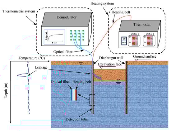 Diagram illustrating the leakage detection system for diaphragm wall joints (LDS-DWJ). The temperature measured using the fiber Bragg grating (FBG) sensors fluctuates at the point where the fiber encounters water leakage (modified from Zheng et al., 2020 [15]).