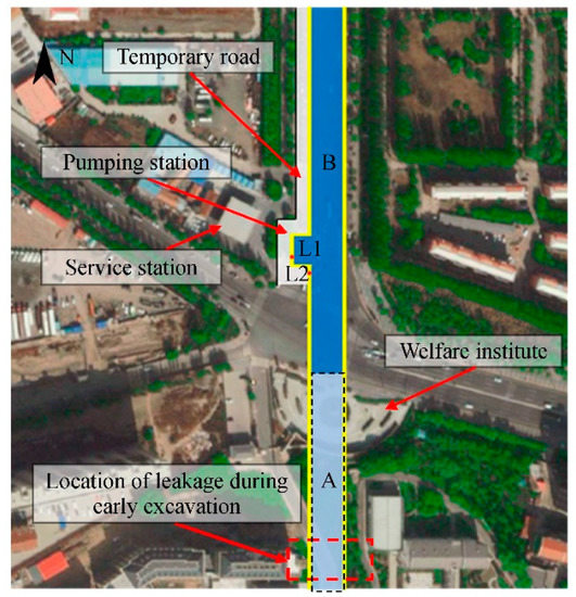 The location of the pit intended for the pumping station in Zone B (had not yet been excavated) is highlighted in Figure 2. The local depth of the excavation is 15 m at Point L1, while it is 10 m at Point L2). There is a temporary road to the west side of the pumping station carrying lots of vehicles (it is, in fact, one of the main roads connecting north and south Hohhot). If the D-walls in this area were to have defects in their joints, then leakage could occur with water inrush and (possible) piping during excavation. This could result in land subsidence and lead to disaster; it would certainly have an adverse effect on traffic. In addition, the workers in the pit and people walking on the temporary road would also be put in danger. Therefore, the LDS-DWJ was applied in this area to detect potential leaks in the joints of the D-walls.
