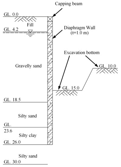 The LDS-DWJ was applied to the D-walls constructed in this part of the excavation project. Figure 3 presents a schematic diagram of a typical cross-section of the deep excavation in the area of the pumping station. The maximum depth of the excavation in this area is 15 m (10 m in the area outside the pumping station). The excavation is 37.6 m wide near the pumping station, while it is 30.6 m in the other areas. The excavation was protected by installing multi-propped D-walls to a depth of 26 m. These are generally 1000 mm thick, and are intended to act as a waterproof curtain to facilitate dry conditions in the deep excavation. The length of a single wall panel ranges from 3.3 to 6.0 m, depending on the precise circumstances encountered. Adjacent panels were joined together using I-shaped metal sheets (Figure 4).