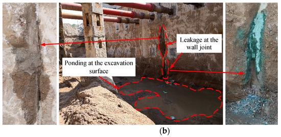 Leakage occurring in the wall joint after finishing excavation. (a) leakage occurring at L1; (b) leakage occurring at L2.