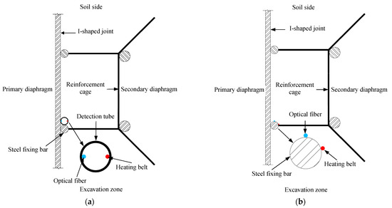 (I) Tubes made of stainless steel: the optical fibers containing FBG sensors and the heating belt were pasted onto the inside surface of the tube, which was then arranged vertically along the D-wall joint (Figure 6a). A steel fixing bar was welded to the end of the steel reinforcement cage and used to fix the position of the detection tube. The detection tube was installed on the inner surface of the steel fixing bar to prevent it from being damaged by collisions occurring between the primary D-wall and side wall of the trench as the steel reinforcement cage was put into the trench.