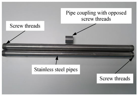 The detection tube at L1 was made of 26 stainless-steel pipes, each 1 m in length and 25 mm in diameter with a wall thickness of 1.5 mm. Both ends of each pipe have screw threads cut onto their external surfaces to allow adjacent pipes to be connected together. This is accomplished using coupling tubes that are internally threaded with screw threads that are opposite to but otherwise identical to those on the 1 m pipes (Figure 9).