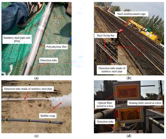 Photographs showing some of the installed parts of the detection system at L1: (a) a coupling tube between two adjacent short pipes wrapped in polyethylene (PE) film; (b) the detection tube fixed to the reinforcement cage; (c) cables outside the detection tube protected by bubble wrap; (d) detection point L1 after the installation of the facilities had been finished.