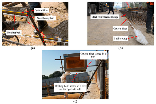 (II) A tubeless configuration: in this scheme, the optical fiber with FBG sensors and the heating belt were directly attached to the steel fixing bar. The relative positions of the optical fiber, heating belt, and steel reinforcement cage are shown in Figure 6b. As in the other scheme, the optical fiber and heating belt were installed on the inner surface of the fixing bar to prevent them from being damaged when the steel reinforcement cage was put into the trench.