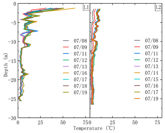 Figure 12 also presents the temperature distributions recorded at L2 on different days before pit excavation. The general trends at L2 are essentially the same as those observed at L1 and for the same reasons. Once again, the temperature falls from the top of the wall to a depth of about 13 m, and the temperature below this point is lower than that above. Furthermore, the temperatures of the deeper areas (below 13 m) once again vary very little and the temperature at a given depth varied on different days due to heat generated by the hydration of the concrete (as it did at L1).