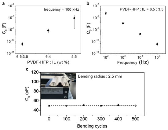where P is the applied pressure, optimization of the operation frequency was necessary. Additionally, the mechanical stability of PVDF-HFP/IL film is important in achieving highly stable devices. To evaluate the mechanical stability of PVDF-HFP/IL film, we performed a cyclic bending test of the pressure sensor (500 cycles at a bending radius of 2.5 mm) and traced the relative change of the C0 value. As shown in Figure 2c, the C0 value was only changed by 2.7% after the bending test, indicating that the PVDF-HFP/IL film had good mechanical stability.