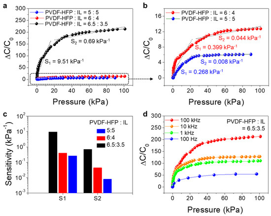 (a,b) Pressure-sensing characteristics (ΔC/C0 vs. P) of PVDF-HFP/IL-based pressure sensors fabricated with different PVDF-HFP:IL ratios (5:5 (blue), 6:4 (red), and 6.5:3.5 (black). (c) The pressure sensitivities in the low-pressure (0–20 kPa) (S1) and high-pressure (20–100 kPa) regions. S1 and S2 represent the sensitivity values at low pressure and high pressure, respectively. (d) Frequency-dependent pressure-sensing characteristics of the PVDF-HFP/IL-based pressure sensors (PVDF-HFP:IL ratio = 6.5:3.5).