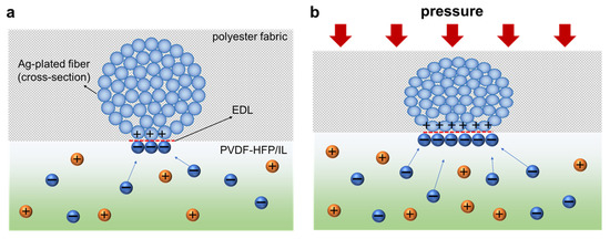 where ε is permittivity of the dielectric, A is the area, and d is the thickness of the dielectric film. Then, by applying an external pressure, the area and the thickness of the dielectric film can be changed, thereby increasing the capacitance. In our device structure, it was suggested that although the thickness of PVDF-HFP/IL film was decreased by pressure, the increase of contact area made between the multi-filament fiber electrodes and the PVDF-HFP/IL film was considered as the dominant mechanism for the capacitance variation [36], particularly at low pressures. When there was no external force, the contact area made between the fiber electrodes and the PVDF-HFP/IL film was small where the EDL can be formed (Figure 4a). However, as the applied pressure was increased, the multi-filament fiber structure was deformed and pushed into the PVDF-HFP/IL film, which increased the contact area of the EDL formation (Figure 4b). As a result, the capacitance value increased with the applied pressure. However, after a certain level of pressure, in our case at around P—20 kPa, the rate of contact-area increase was reduced, and the capacitance variation was also reduced, resulting in lower sensitivity (Figure 3a,b).