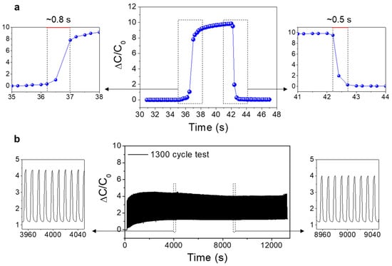 The response characteristics of the pressure sensor are also important parameters for determining the applications of the sensor. Figure 5a shows the response characteristics of PVDF-HFP/IL textile pressure sensor (PVDF-HFP:IL ratio = 6.5:3.5). Under the loading condition, the extracted response time was −0.8 s, and under the unloading condition, the response time was −0.5 s. The response rate of our sensor was relatively slow compared to previous IL-based pressure sensors or fabric-based pressure sensors (0.1–0.3 s) [42,43,44,45]. The relatively slow response characteristics were due to the viscoelastic property of the PVDF-HFP/IL film and the complicated weaving structure of the multifilament fiber electrodes on the fabric sheet [36,46,47,48]. However, considering the potential applications of PVDF-HFP/IL pressure sensors, such as monitoring of pressure distribution from a body, these response characteristics could be sufficient [36,48]. Additionally, the operation stability of the PVDF-HFP/IL pressure sensor was evaluated. Figure 5b shows the results from a cyclic test carried out for 1300 cycles of loading and unloading. As displayed, the sensor exhibited relatively stable operation up to 1300 cycles without noticeable degradation of the sensing performance. It should be noted that in the initial period of the cyclic test, the capacitance value in unloading states increased slightly and later stabilized. This can be attributed to the formation of a closer contact between the fiber electrodes and the PVDF-HFP/IL film due to repeated pressure.