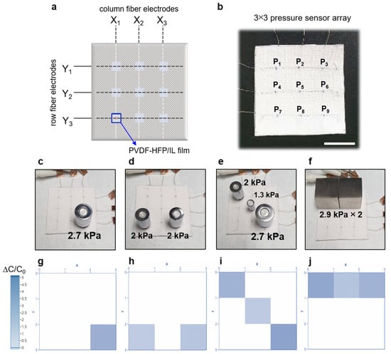 To demonstrate the applicability of the PVDF-HFP/IL pressure sensors, a matrix-type 3 × 3 pressure sensor array was fabricated using polyester fabrics. Figure 6a,b show the schematic layout and optical image of the 3 × 3 pressure sensor array. Since the PVDF-HFP/IL-based pressure sensor had a cross-point structure, a matrix-type array could be simply constructed for multi-point detection. The column fiber electrodes were designated as Xn (n = 1,2,3), and the row fiber electrodes were designated as Yn (n = 1, 2, 3) (Figure 6a). As shown in Figure 6b, each sensing point was designated as Pn (n = 1–9). Because the 3 × 3 pressure sensor array operated based on the capacitance variation, a multi-point pressure detection was possible. To demonstrate the multi-point pressure detection, one to three separate objects were placed at different sensing points on the sensor array (Figure 6c–f). The mapping of the capacitance values was carried out by using a homemade array tester composed of an LCR meter and a digital multimeter/switch system [36]. As shown in Figure 6g–j, the 3 × 3 sensor array could detect the positions and the weights of the objects without significant crosstalk between the sensing points. These results suggest that the textile pressure sensors implementing PVDF-HFP/IL film and multi-filament fiber electrodes could be successfully adopted in e-textile applications for multi-point detection.