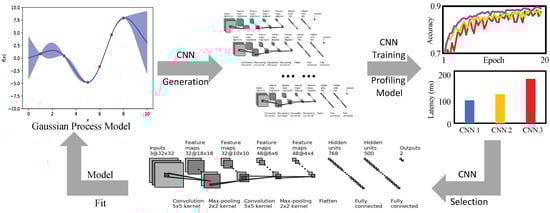 From the above equation, it can be seen that the goal of Bayesian optimization is to find x from the candidate set S to maximize . When Bayesian optimization is applied for the purpose of searching for the CNN, each input x is a CNN structure, and its corresponding output is the accuracy and inference latency of this CNN structure. Here, it is assumed that satisfies the Gaussian distribution, with the prior distribution of , and then new CNNs can be gradually added so as to update the distribution. These new CNNs are obtained from the previously generated network structure through network morphism, such as widening the layers and increasing the number of layers of the network. Subsequently, by continuously correcting and modifying the original assumed prior distribution according to the newly added CNNs, we can finally get the real distribution and the CNN with a trade-off between accuracy and inference latency that can be effectively deployed on the edge devices.