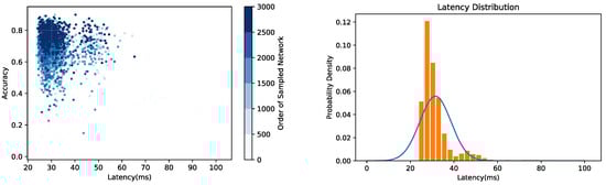 Here, a preliminary experiment is conducted on the basis of [24]. To be specific, the accuracy and inference latency of the neural network are set as the search objectives to construct Multi-Objective NAS and confirm the application requirement for inference latency as 30 ms. The neural network search is performed on the CIFAR-10 dataset. Furthermore, the accuracy and inference latency of the 3000 sampled network structures are measured during the search process. The results are shown in Figure 2. Although the accuracy of the network structure is gradually improved and the inference latency converges to the application requirement, the distribution range of the inference latency is still extremely large. It can be seen that when the accuracy of the searched network structure exceeds 80%, the distribution of the inference latency is still mainly between 25 and 35 ms, and the standard deviation (std) of their inference latency is 7.14. In addition to that, the std of the inference latency of the first 2000 sampled network structures is also calculated, and it is 7.80, similar to the inference latency std of the network in which the accuracy exceeds 80%, which means that the inference latency of the searched network with high accuracy is still fluctuating continuously. This result shows that the search process is not constrained by the two-dimensional constraints of accuracy and inference latency. At the same time, it is difficult to reflect a clear trade-off between accuracy and inference latency along the search process. As a result, when the accuracy is gradually enhanced, a large amount of network sampling and training is still required to obtain the optimal network structure, which seriously affects the search efficiency. Therefore, in order to solve this problem, an efficient NAS method is put forward.