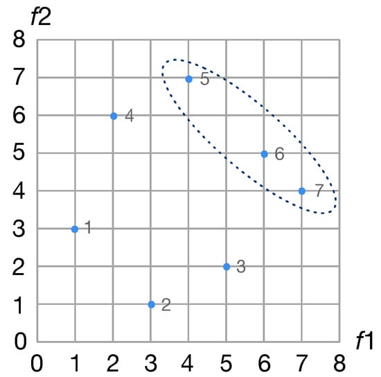 An example of the Pareto front. Solution 5, 6 and 7 are the non-dominant solutions, and they are the Pareto front.