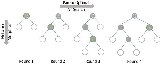 It can be seen from Figure 4 that in the first round of search, the initialized CNN is subjected to morphism of the new CNNs according to the determined morphism direction with the GP model. Then, we can obtain the Pareto front of the accuracy and inference latency of these networks and sort them with the search. Furthermore, node 1 is selected after the first round of the search. Here, the structural features and morphism selections of node 1 will be applied to update the GP model. Since node 1 satisfies the high-accuracy and low-latency search objectives, in this round of network morphism, the changes in accuracy and resource consumptions caused by changes in network structure will be reflected in the Gaussian distribution and guide the subsequent network morphism. Thus, it is shown that when the search algorithm has hardware resource awareness, the search direction can be regulated. Later, in the second round of the search process, network morphism is performed on the basis of node 1, and the above operations are repeated. In addition, in each round of the search process, all the morphed CNNs are sorted, and each node has the opportunity to be selected for network morphism. Therefore, in round 4, node 3 is selected to be morphed rather than simply expand the child nodes of node 2. Through the above search method, by continuously evaluating the CNNs that have been selected and the new CNNs obtained by network morphism, we can more clearly know about the impact of operation selection and network structure expansion in the network morphism process on the accuracy and inference latency and have a trade-off between accuracy and inference latency. Based on this, the GP model can be updated, and the adaptive relationship between operation selections and resource consumptions will be recorded. After updating the GP model multiple times, it has a preference for network morphism to some extent. At this time, the GP model is adopted to get the direction of the network search for further guiding the search process more efficiently. In addition, the search can morph the networks from the nodes that are known but not searched, instead of only expanding the current optimal node, and the Simulated Annealing Algorithm assigns a probability mutation that is time-varying and tending to zero. The combination of these two methods can prevent the search process from falling into a local optimum.