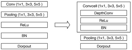 Due to the number of options when morphing the network in [33], the huge search space will greatly reduce search efficiency. In this part, the search space of the Bayesian search is optimized to enhance the search efficiency from the following two aspects: (1) The cell-based structure is applied to reduce the number of the options for further decreasing the amount of sampled networks during the search process, thereby, reducing the search space and improving the search efficiency; (2) the lightweight convolutional operation replaces the traditional convolutional operation to reduce the computation workloads, enhance the training efficiency during the search process and further improve the overall search efficiency.