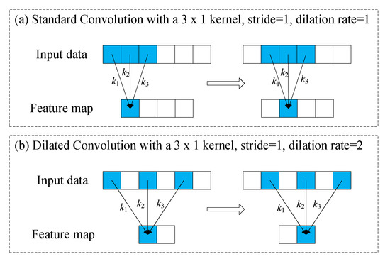 To explain dilated convolution, we compare it with a standard convolution as shown in Figure 1. We assume that the input data is six-dimensions, kernel is , stride is 1. According to Equation (1), the output is in Figure 1a, where