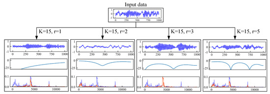 Several typical amplitude-frequency characteristic curves and the signals after convolution without activation function. K is the kernel size, and r is the dilation rate. In the four parallel subgraphs below, the first row is the output of signal after convolution, the second row is the amplitude-frequency characteristics (AFC) curve, and the third row is the FFT spectrogram. In FFT spectrogram, the blue line represents the original signal, the red line represents the output signal.