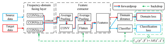 For domain adaptation, the source data and target data are trained jointly. Source data and target data are mapped to source features and target features by the feature extractor. The discrepancy measured by between and is calculated as a domain adaptation loss, is classified by softmax layer and classification loss is obtained. Domain loss and classification loss together are optimized as a total loss. Back propagation (BP) algorithm is used to upgrade each layer’s parameters until the loss converges or reaches the maximum number of iteration.