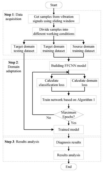 - Step 2: Domain adaptation. Based on the specific fault diagnosis problem and dataset information, the FFCNN configuration is chosen. The details of FFCNN used in this paper have been stated in Section 5.1. For training stage, FFCNN is trained by source training data and target training data based on Algorithm 1. For the testing stage, the target testing data are fed into trained FFCNN to get classification results.