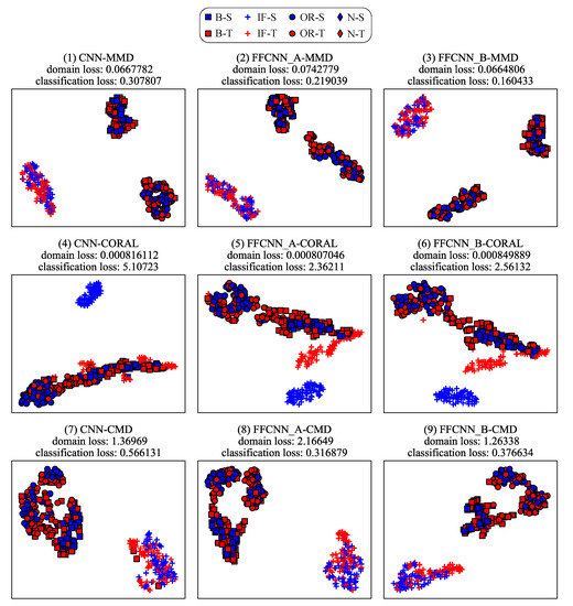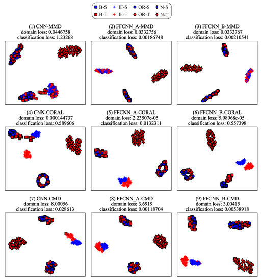 Domain adaptation aims to align features of different domains. That is to say, domain adaptation will reduce the classification loss of source domain as well as the discrepancy between the source domain and target domain (called domain loss). So the features of different categories from the same domain can be dispersed as much as possible, and features of the same category from different domains can be gathered as much as possible. To illustrate the effectiveness of FFCNN from this perspective, we use task and as examples to visualize the features after the adaptation using t-SNE algorithm [46] in Figure 11 and Figure 12. For each subgraph, the domain loss and classification loss are also shown above. From the figures, we can see that the feature distributions of categories between the source domain and target domain are not aligned well without frequency-fusing method, such as ball fault and inner race fault in CNN-MMD of Figure 11. But under FFCNN framework, the improvement of distribution adaptation is noticeable. For example, in CNN-MMD of Figure 11, categories of source domain or target domain are separated, but didn’t align the feature distributions of the same category between source and target domain. On the contrary, FFCNN-A-MMD successfully aligns the feature distributions between domains, and the domain loss is , which is better than of CNN-MMD. This improvement has raised the accuracy of CNN-MMD from 80.98% to 94.80%, and reduced the classification loss from 1.23268 to . Similarly, the improvement of aligning effect will improve accuracy in other tasks.