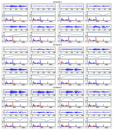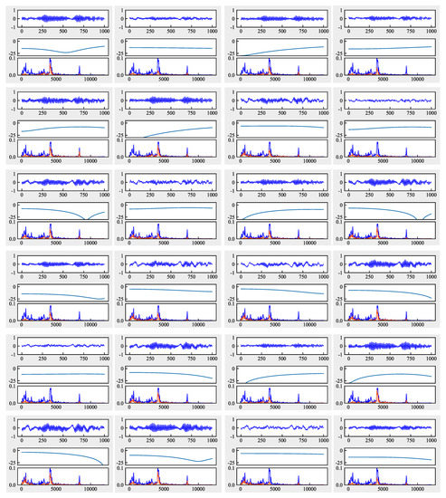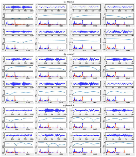Figure 13, Figure 14 and Figure 15 give the convolved signals, AFC curves, and FFT spectrogram of each filter in the first layer of CNN-MMD, FFCNN-A, and FFCNN-B from task . Signals, AFC curve and FFT spectrogram form a sub-figure in a figure vertically. For the FFT spectrogram, the blue curve represents the FFT of input signal, and red represents the FFT of convolved signal. Combining FFT spectrogram, We can see that, compared with multi-scale convolution, the frequency band perceived by ordinary CNN is single. Signals filtered by different frequency bands will contain more significant useful information, and frequency bands that do not contribute to fault classification will be suppressed. During the training process, the network will learn which frequency bands are useful and which are not according to the loss function changes.