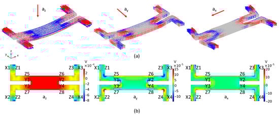 Numerical simulation results of the stationary analysis using COMSOL. (a) The structural deformation and stress distribution along the x, y, z-axis: the red arrow indicates tensile stress and the blue arrow indicates compressive stress; (b) The voltage distribution of tri-axial piezoelectric accelerometer along x, y, z-axis at the acceleration level of 1 g.