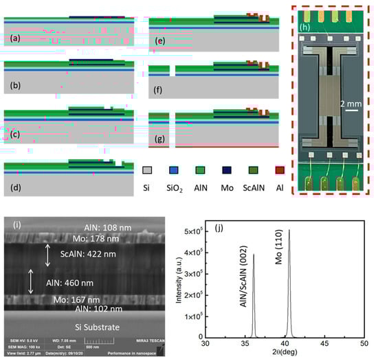 Figure 5i shows the scanning electron microscope (SEM) image of the fabricated device. However, the thickness of the thin films is smaller than the designed value due to the deviation of the fabrication process. Figure 5j shows the Measured X-ray diffraction (XRD) spectrum of the Mo/AlN/ScAlN/Mo composite thin film. Since the (002) peaks of AlN and ScAlN are very close and superimposed, the curve just shows two sharp peaks corresponding to AlN/ScAlN (002) and Mo (110).