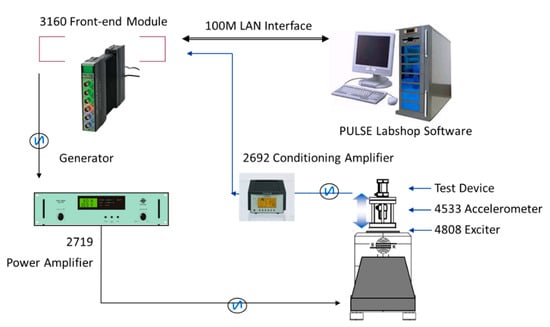 The fabricated piezoelectric accelerometers are measured using a setup illustrated in Figure 6. The vibration test calibration system can be used for measuring charge sensitivity characteristics over a frequency range from 3 Hz to 6.4 kHz. The PCB is rigidly fixed on the calibration fixture of the exciter (B&K 4808), while a reference accelerometer (B&K 4533-B) is installed under the fixture to measure the real-time acceleration generated by the exciter. The amplitude, frequency, and bandwidth of sinusoidal vibration can be controlled by B&K PULSE Labshop software and a power amplifier (B&K 2719). The output charge signal from the piezoelectric stack is converted into a voltage signal by a conditioning amplifier (NEXUS 2692) and then read by the data acquisition module of the frond-end setup (B&K 3160). By changing the fixture and clamping position, the testing system can measure the sensitivity in the x, y, z-axis directions, respectively. In addition, the capacitances of terminal X, Y, Z () are measured by LCR Meter (E4980A), respectively.
