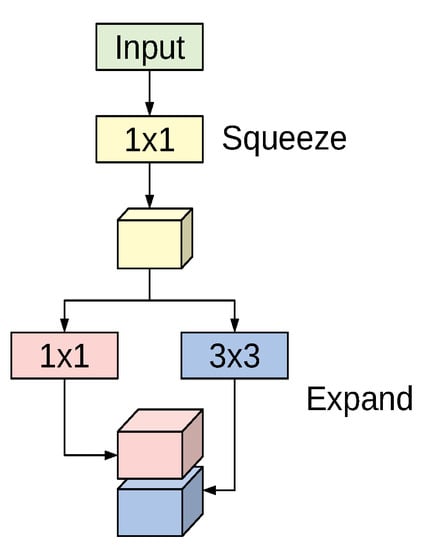 The SqueezeNet architecture is a deep CNN proposed for computer vision tasks with the main concerns on efficiency (having fewer parameters and smaller model size) [42]. The basic building block for the SqueezeNet architecture is the fire module depicted in Figure 1. The module incorporates a squeeze phase and an expand phase. The squeeze phase applies a set of filters followed by a ReLU activation. The number of learned squeeze filters is always smaller than the size of the input volume. Consequently, the squeeze phase can be considered as a dimensionality reduction process, and at the same time it captures the pixel correlations across the input channels. The output of the squeeze phase is fed into the expand phase, in which a combination of and convolutions are learned. The larger filters are used to capture the spatial correlations amongst pixels. The outputs of the expand phase are concatenated across the channel dimension and then evaluated by a ReLU activation.