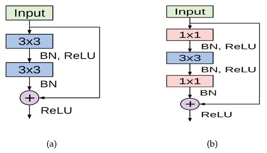 The cornerstone for constructing deep residual networks is the residual module, of which two variants are depicted in Figure 3. The left path of the residual module in Figure 3a is composed of two convolutional layers, which apply kernels and preserve the spatial dimensions. Batch normalization and ReLU activation are also applied. The right path is the skip connection where the input is added to the output of the left path. This variant is used in the ResNet18 model. Another variant of the residual module named the bottleneck residual module is depicted in Figure 3b, in which the input signal also passes through two branches. However, the left path performs a series of convolutions using and kernel sizes, along with batch normalization and ReLU activation. The right path is the skip connection, which connects the module’s input to an addition operation with the output of the left path. This variant is utilized in ResNet50 and ResNet101 models.