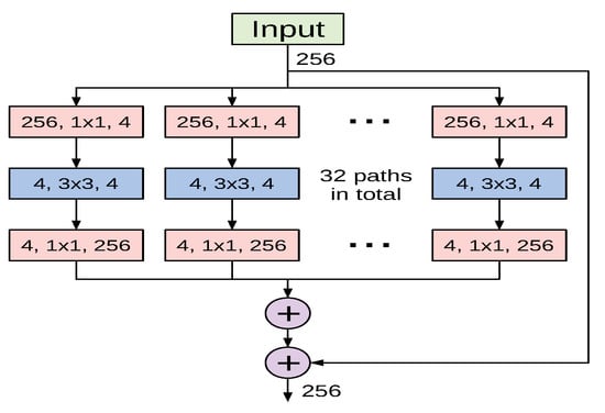 - Xie, S.; Girshick, R.; Dollár, P.; Tu, Z.; He, K. Aggregated residual transformations for deep neural networks. In Proceedings of the IEEE Conference on Computer Vision and Pattern Recognition (CVPR), Honululu, HI, USA, 21 July–26 July 2017; pp. 1492–1500. [Google Scholar]