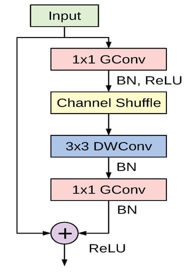 The cornerstone of the ShuffleNet model is the ShuffleNet unit depicted in Figure 5. It is a bottleneck residual module in which the convolutional layer is replaced by a depthwise separable convolution as in [45]. Additionally, the first convolutional layer is replaced by a pointwise group convolution followed by a channel shuffle operation. The second pointwise group convolutional layer is used to retrieve the channel dimension to match the left path of the unit. The overall ShuffleNet network is composed of a stack of these units grouped into three different stages along with other conventional convolution and pooling layers.