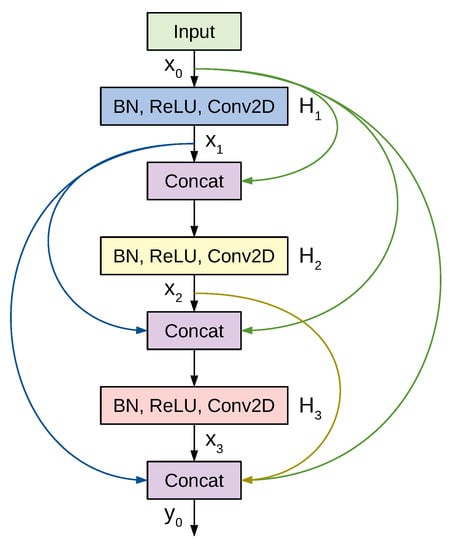 Figure 6 shows a 3-layer dense block where each layer performs a set of batch normalization, ReLU activation, and convolution operations. Previous feature maps are concatenated and provided as the input to a subsequent layer, which then generates k feature maps, where k is a newly introduced hyper-parameter denoted as the growth rate. Thus, if the input to layer is , then the number of feature maps at the end of a 3-layer dense block is . To prevent the number of feature maps from increasing too rapidly, DenseNet introduces a bottleneck layer with convolution and filters. To tackle the difference in the feature map sizes when transitioning from a large feature map to a smaller one, DenseNet applies a transition layer made of convolution and average pooling.