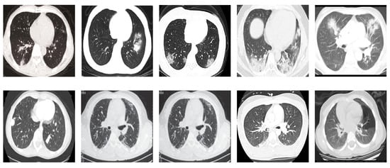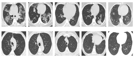 COVID19-CT dataset [54]: The dataset consists totally of 746 CT images. There are 349 CT images of patients with COVID-19 and 397 CT images showing non-COVID-19, but other pulmonary diseases. The positive CT images were collected from preprints about COVID-19 on medRxiv and bioRxiv, and they feature various manifestations of COVID-19. Since the CT images were taken from different sources, they have varying sizes between and . Figure 8 shows example CT images from the COVID19-CT dataset.